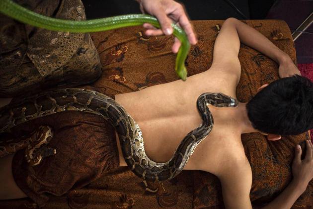 En algunos casos se ofrece una mezcla heterogénea de serpientes no venenosas que son las que proporcionan el masaje a los intrépidos clientes, en otros casos, quienes ofrecen estos servicios afirman que sólo pueden ser proporcionados de manera eficaz por serpientes constrictoras como la Piton, Capaces de ejercer la presión necesaria para qué el masaje surta efecto. Obviamente en este caso la oferta se complementa con la seguridad de las serpientes con la boca cerrada, suponemos que para evitar las tentaciones que el animal puede tener durante el proceso. Se trata de programas que hoy en día se ofrecen en países como Indonesia, Tailandia o Rusia entre otros.