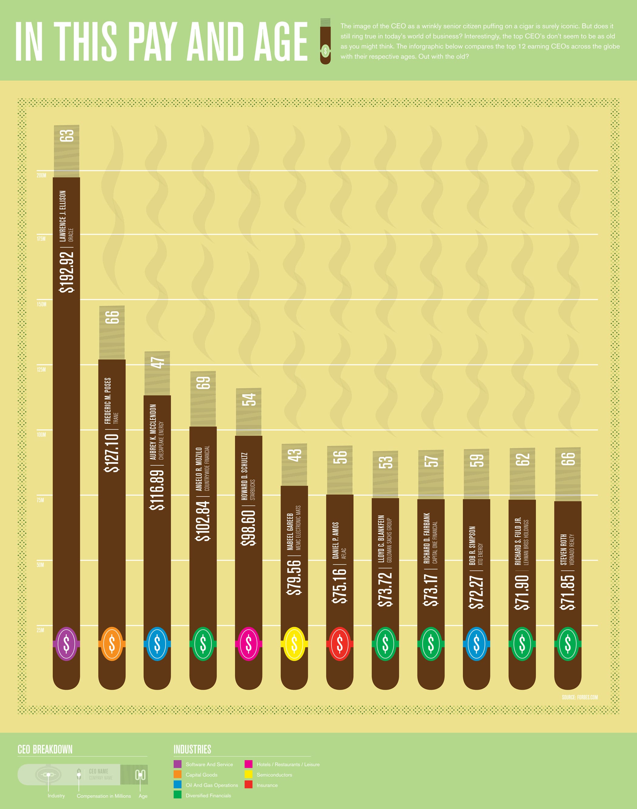 Haciendo referencia al mito por el cual nos imaginamos a los jefes de empresa como personas viejas con el whiskey en una mano y un puro en la otra, según la estadísitica recogida por Forbes en la que figuran los 12 CEO que más dinero ganan del mundo, el mito no es cierto del todo. Y es que, para empezar, la edad media de los mejor pagados es de 57 años, lo cual tampoco es una edad tan avanzada como la que nos hacen creer los dibujos animados.